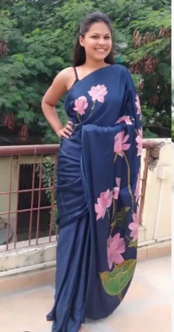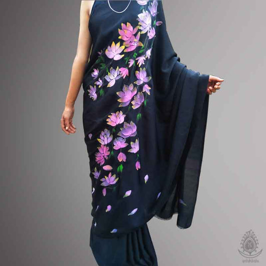Black Handpainted Lotus Saree | Pure Satin Saree By Rank Never Retires