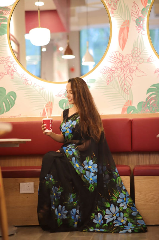 Pure Chiffon Black Beauty Handpainted Saree by RNR