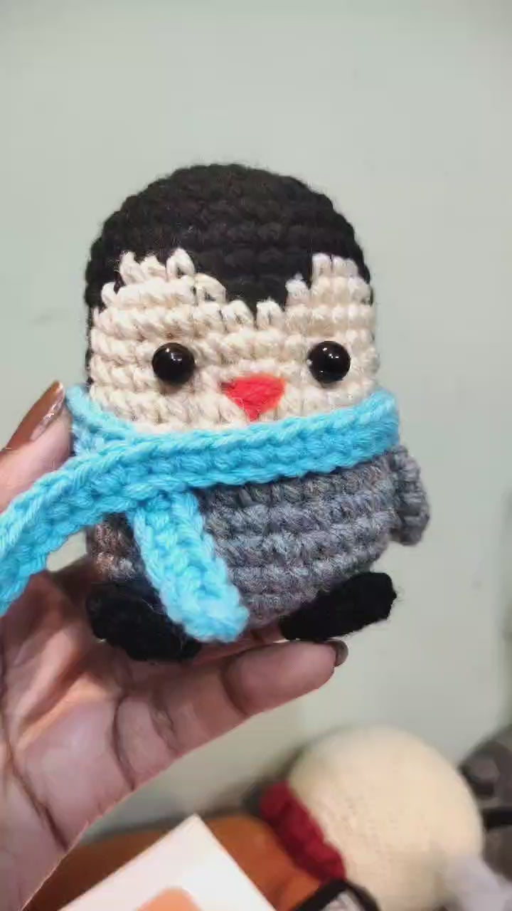 This playful penguin is handknitted and stuffed with cotton, ready to be gifted to your favorite people.